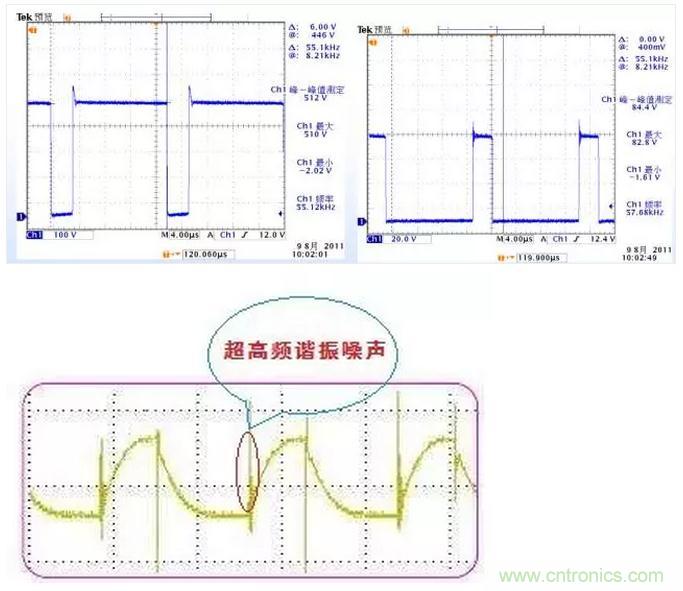 超高頻諧振噪聲主要來源于高頻整流二極管反向恢復(fù)時二極管結(jié)電容、功率器件開關(guān)時功率器件結(jié)電容與線路寄生電感的諧振,頻率一般為1~10MHz,通過選用軟恢復(fù)特性二極管、結(jié)電容小的開關(guān)管和減少布線長度等措施可以減少超高頻諧振噪聲。