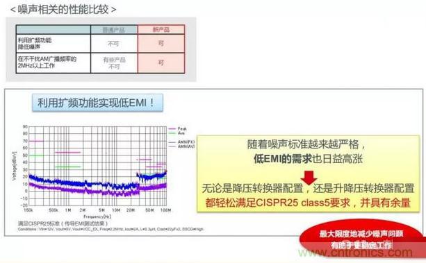 「BD8P250MUF-C」內(nèi)置擴(kuò)頻功能,以滿足抗電磁干擾(Electromagnetic Interference, 以下簡稱“EMI”)方面不斷增長的市場需求。實(shí)現(xiàn)低EMI,滿足汽車領(lǐng)域噪聲國際標(biāo)準(zhǔn)“CISPR25”。同時(shí),采用ROHM獨(dú)有的超高速脈沖控制技術(shù)「Nano Pulse Control」始終在不干擾AM廣播頻段(1.84MHz Max.)的2.2MHz頻率下工作,對于最大36V的高電壓輸入,還實(shí)現(xiàn)了驅(qū)動(dòng)ECU的5V穩(wěn)定輸出。