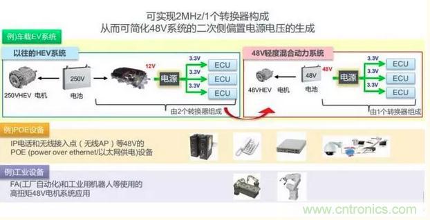 其中,一次電源主要是從48V或12V降到5V或3V,用于車載導(dǎo)航等。二次電源是從5V降到1.25到1V,用于ADAS(高級駕駛員輔助系統(tǒng))等,未來的技術(shù)趨勢是更小封裝,開發(fā)高附加價(jià)值的電源IC。
