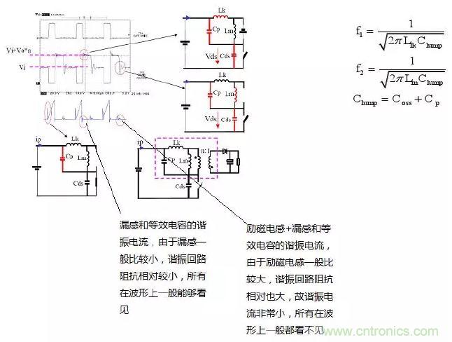 f1比f2大很多(從波形上可以看出),這是由于漏感一般相對(duì)較小;同時(shí)由于f1所在回路阻抗比較小,諧振電流較大,所以能夠很快消耗在等效電阻上,這也就是為什么f1所在回路很快就諧振結(jié)束的原因?。ň唧w諧振時(shí)間可以通過等效模型求解:二次微分方程估算)