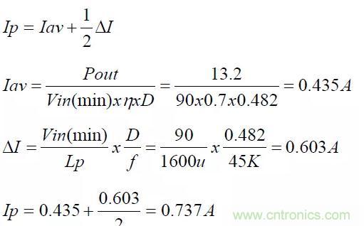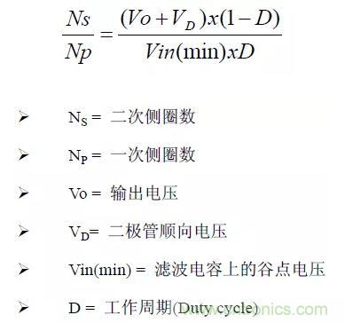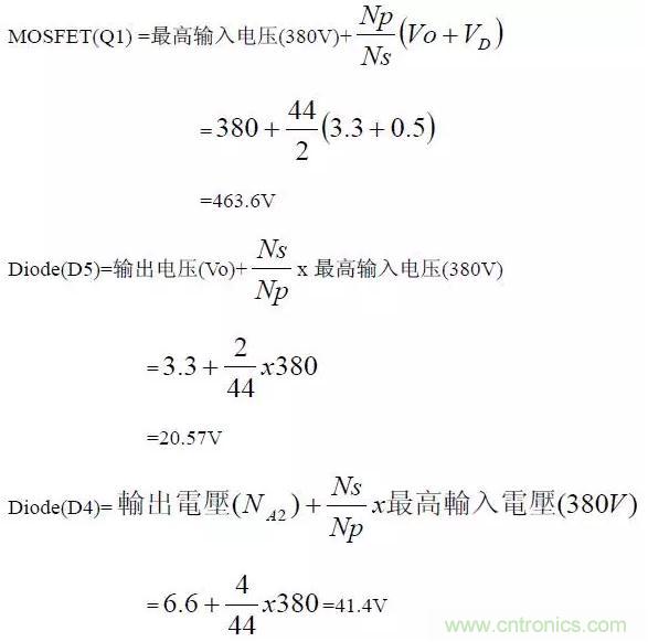 依據(jù)變壓器的圈比關(guān)系,可以初步計算出變壓器的應(yīng)力(Stress)是否符合選用零件的規(guī)格,計算時以輸入電壓264V(電容器上為380V)為基準。