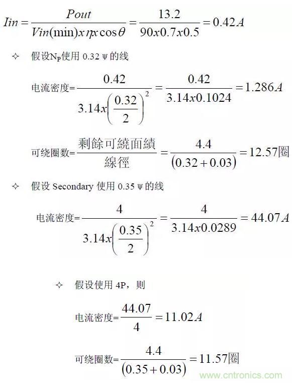 當(dāng)變壓器決定后,變壓器的Bobbin即可決定,依據(jù)Bobbin的槽寬,可決定變壓器的線徑及線數(shù),亦可計算出線徑的電流密度,電流密度一般以6A/mm2為參考,電流密度對變壓器的設(shè)計而言,只能當(dāng)做參考值,最終應(yīng)以溫升記錄為準。