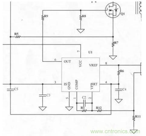 濾除3843 Pin3腳的噪聲,R5一般使用1KΩ 1/8W,C3一般使用102P/50V的陶質(zhì)電容,C3若使用電容值較小者,重載可能不開機(因為3843 Pin3瞬間頂?shù)?V);若使用電容值較大者,也許會有輕載不開機及短路Pin過大的問題。
