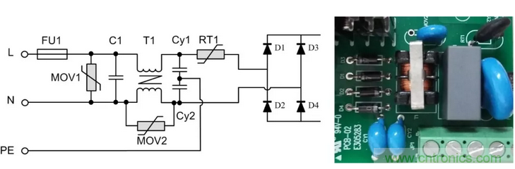 背景:以某型號的電源模塊為例,該模塊是ZLG致遠電子為某客戶定制的電源模塊,輸入85VAC~350VAC,且EMC前級電路電路嵌入到模塊中??估擞恳蟛钅k妷?KV,共模電壓6KV。更換更大的保險絲后可承受6KV差模電壓。其前級原理圖及對應(yīng)實物圖如圖2所示。
