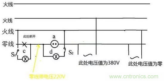 給出草圖當(dāng)零線斷開時(shí),如過上端負(fù)載有未斷開的情況,如圖S2閉合的情況火線與零線通過負(fù)載的線圈串聯(lián)到了一起,那么零線就是和火線帶一樣的電壓值。你家里的零線如果是從斷點(diǎn)后端接出來的,電壓值如上圖兩種情況380V或者零伏。