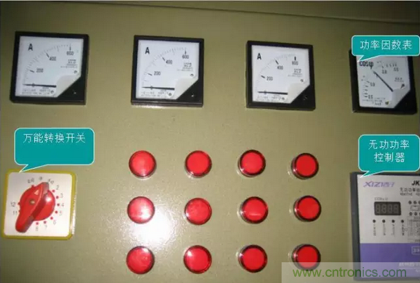 三個電流表A、一個功率因數(shù)表COS;功率控制器PK;萬能轉(zhuǎn)換開關(guān)
