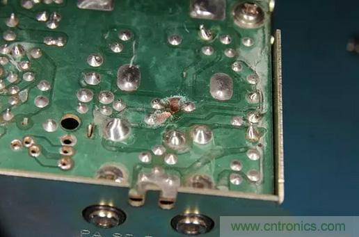 大部分情況下,除了電路板上被炸出的銅走線,反向極性二極管也會(huì)短路,必須更換。但這次,我們很走運(yùn),二極管性能良好。所以,現(xiàn)在我們必須修復(fù)這個(gè)開路走線。