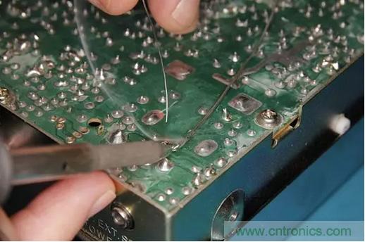 接著焊接導(dǎo)線的另一個(gè)端點(diǎn)到PCB斷開走線對(duì)應(yīng)的另一個(gè)焊點(diǎn)上。