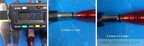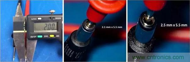 這個技巧有點小竅門。大多數(shù)測試探針你會發(fā)現(xiàn)其直徑都是2mm的,這也就意味著,2.1mm和2.5mm內徑的接頭都可以插進去。所以,就需要觀察一下探針和孔洞內壁間是否有明顯縫隙。測試探針插入2.1mm接頭時孔洞內壁和測試表筆頭間無明顯間隙,但2.5mm接頭和測試筆頭就有明顯縫隙。