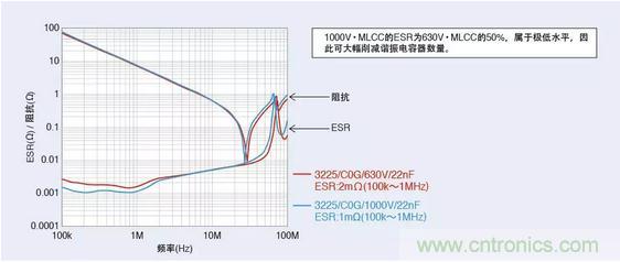 圖3:630V·MLCC與1000V·MLCC的阻抗-頻率特性以及ESR-頻率特性的比較