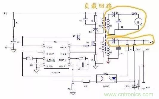 4)負(fù)載回路:N3,N4二次繞組及后續(xù)電路,均為負(fù)載回路,負(fù)載回路的異常,會牽涉到保護(hù)回路和穩(wěn)壓回路,使兩個回路做出相應(yīng)的保護(hù)和調(diào)整動作。
