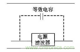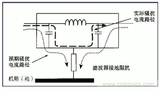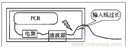 許多設(shè)備的電源線進(jìn)入機(jī)箱后,經(jīng)過很長的導(dǎo)線才接到濾波器的輸入端。例如,電源線從機(jī)箱后面板輸入,走行到前面板的電源開關(guān),又回到后面板接到濾波器。或者濾波器的安裝位置距離電源線入口較遠(yuǎn),造成引線太長(如圖1所示)。