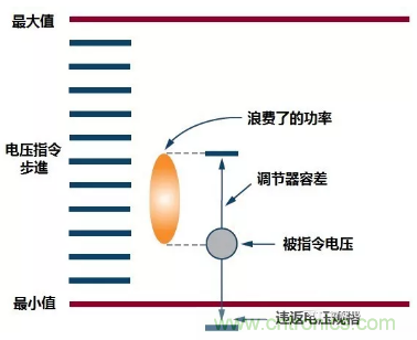 問(wèn)題是大多數(shù)電源調(diào)節(jié)器都不夠準(zhǔn)確。調(diào)節(jié)電壓可以在被指令電壓附近的公差范圍內(nèi)的任何地方,并且它可以隨負(fù)載條件、溫度和老化而漂移。±2%容差的電源即表示可以在4%的電壓范圍內(nèi)輸出任何值。為了補(bǔ)償電壓處于2%過(guò)低的可能性,被指令電壓必須比滿(mǎn)足時(shí)序所需的電壓提高2%。如果經(jīng)過(guò)調(diào)節(jié)器后電壓漂移到高于被指令電壓2%處,它將比該工作點(diǎn)所需的最小電壓運(yùn)行高4%。這仍然符合規(guī)定的FPGA所需的電壓要求,卻浪費(fèi)了大量功率,如下圖2所示。