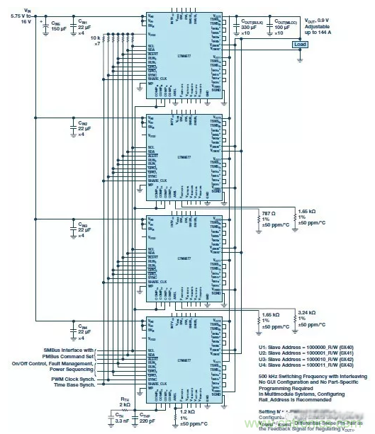 圖7:利用四個(gè)LTM4677模塊并聯(lián)的應(yīng)用電路圖,可提供高達(dá)144A的電流
