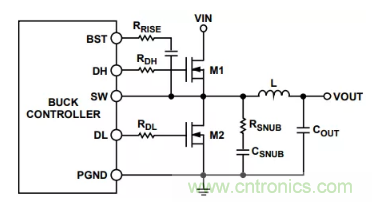 在DH或DL引腳上串聯(lián)一個(gè)小電阻(約2 Ω至4 Ω)可以減慢柵極驅(qū)動,從而也能降低柵極噪聲和過沖。另外,BST與SW 引腳之間也可以連接一個(gè)電阻(參見圖6)。在布局期間用0 Ω柵極電阻保留空間,可以提高日后進(jìn)行評估的靈活性。增加的柵極電阻會延長柵極電荷上升和下降時(shí)間,導(dǎo)致 MOSFET的開關(guān)功率損耗提高。