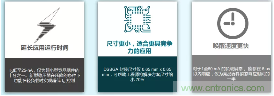 另外,該款LDO更具誘惑的優(yōu)勢則是擁有著超小的體積,DSBGA封裝尺寸只有0.65mm×0.65mm,可幫助工程師將解決方案尺寸縮小70%。對于1至50 mA 的負載瞬態(tài),能夠在5 us以內(nèi)響應,僅為競品器件瞬態(tài)響應時間的一半。