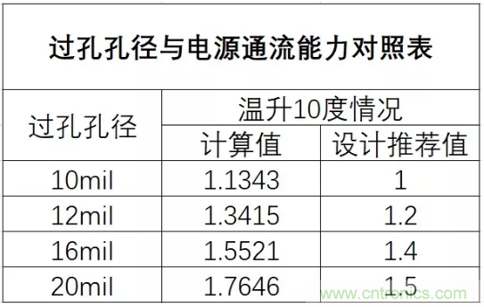 換層時(shí)孔的大小及數(shù)目是否滿足電源電流通流能力。首先要了解單個(gè)過(guò)孔的通流能力,在常規(guī)情況下,溫升為10度,可參考下表。