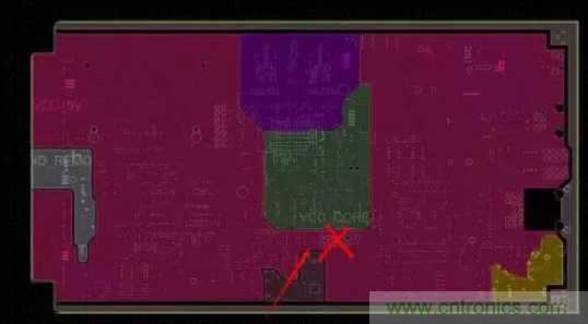 電源分割時(shí),電源與電源平面分割距離盡量保持在20mil左右,如果在BGA部分區(qū)域,可局部保持10mil距離的分割距離,如果電源平面與平面距離過(guò)近,可能會(huì)有短路的風(fēng)險(xiǎn)。