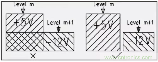 如若在相鄰平面處理電源,要盡量避免銅皮或者走線平行處理。主要是為了減少不同電源之間的干擾,特別是一些電壓相差很大的電源之間,電源平面的重疊問(wèn)題一定要設(shè)法避免,難以避免時(shí)可考慮中間隔地層。