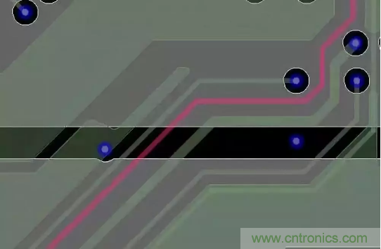 做電源分割時(shí)應(yīng)盡量避免相鄰信號(hào)線跨分割情況,信號(hào)在跨分割(如下圖示紅色信號(hào)線有跨分割現(xiàn)象)處因參考平面不連續(xù)會(huì)有阻抗突變情況產(chǎn)生,會(huì)產(chǎn)生EMI、串?dāng)_問(wèn)題,在做高速設(shè)計(jì)時(shí),跨分割會(huì)對(duì)信號(hào)質(zhì)量影響很大。