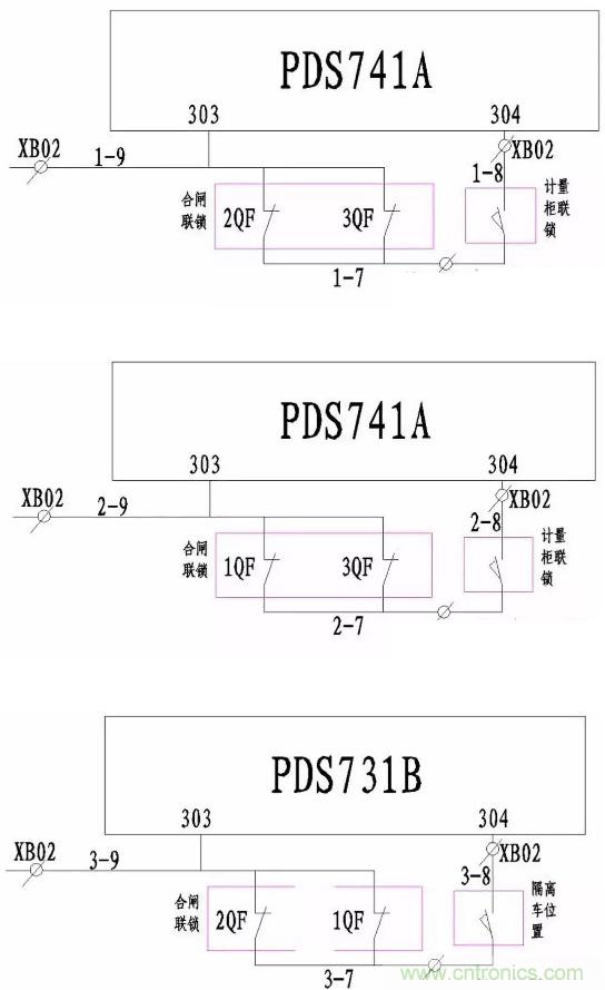 在計(jì)量柜與母聯(lián)隔離柜都到位的情況下,合1QF與2QF。這時(shí)PDS731B的3-7與3-9處于分?jǐn)嗟臓顟B(tài),其304端子無(wú)電源,3QF不滿足合閘條件。同理,1QF與3QF合閘時(shí),2QF不滿足合閘條件;2QF與3QF合閘時(shí),1QF不滿足合閘條件。