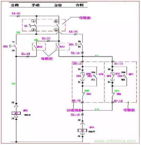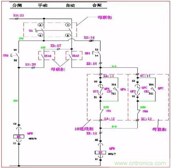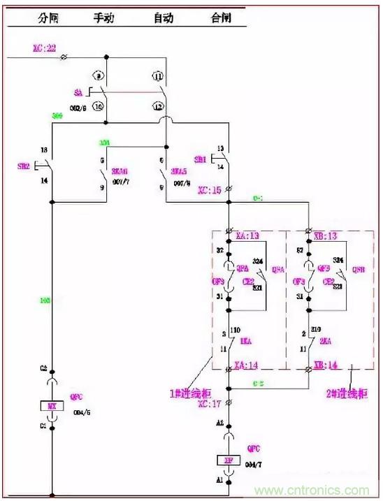 手動(dòng)時(shí):當(dāng)QFA、QFB合閘,QFC合閘回路C-1、C-2斷開,其合閘線圈XF無(wú)法得電, QFC不能滿足合閘條件;同理,當(dāng)QFA、QFC或QFB、QFC同時(shí)合閘時(shí),QFB或QFA也同樣不能滿足合閘條件。使進(jìn)線柜與母聯(lián)滿足“三合二”邏輯。