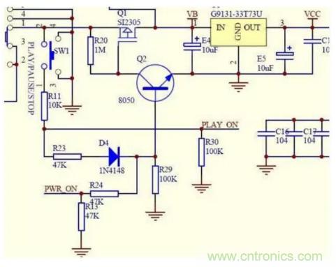 圖中電池的正電通過開關(guān)S1接到場效應(yīng)管Q1的2腳源極,由于Q1是一個P溝道管,它的1腳柵極通過R20電阻提供一個正電位電壓,所以不能通電,電壓不能繼續(xù)通過,3v穩(wěn)壓IC輸入腳得不到電壓所以就不能工作不開機(jī)!這時,如果我們按下SW1開機(jī)按鍵時,正電通過按鍵、R11、R23、D4加到三極管Q2的基極,三極管Q2的基極得到一個正電位,三極管導(dǎo)通(前面講到三極管的時候已經(jīng)講過),由于三極管的發(fā)射極直接接地,三極管Q2導(dǎo)通就相當(dāng)于Q1的柵極直接接地,加在它上面的通過R20電阻的電壓就直接入了地,Q1的柵極就從高電位變?yōu)榈碗娢唬琎1導(dǎo)通電就從Q1同過加到3v穩(wěn)壓IC的輸入腳,3v穩(wěn)壓IC就是那個U1輸出3v的工作電壓vcc供給主控,主控通過復(fù)位清0,讀取固件程序檢測等一系列動作,輸處一個控制電壓到PWR_ON再通過R24、R13分壓送到Q2的基極,保持Q2一直處于導(dǎo)通狀態(tài),即使你松開開機(jī)鍵斷開Q1的基極電壓,這時候有主控送來的控制電壓保持著,Q2也就一直能夠處于導(dǎo)通狀態(tài),Q1就能源源不斷的給3v穩(wěn)壓IC提供工作電壓!SW1還同時通過R11、R30兩個電阻的分壓,給主控PLAY ON腳送去時間長短、次數(shù)不同的控制信號,主控通過固件鑒別是播放、暫停、開機(jī)、關(guān)機(jī)而輸出不同的結(jié)果給相應(yīng)的控制點(diǎn),以達(dá)到不同的工作狀態(tài)!