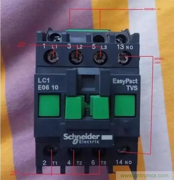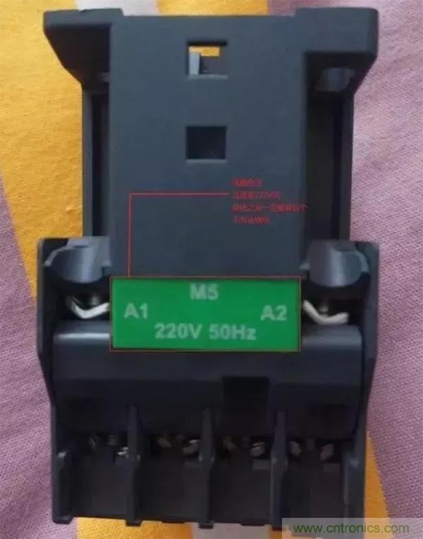 線圈的兩個(gè)接線端子,在接觸器的主觸點(diǎn)的稍下方。也有的接觸器A2有兩個(gè)接點(diǎn),我們?cè)谶\(yùn)用的時(shí)候隨便接哪一個(gè)都行。線圈接線不分零火。