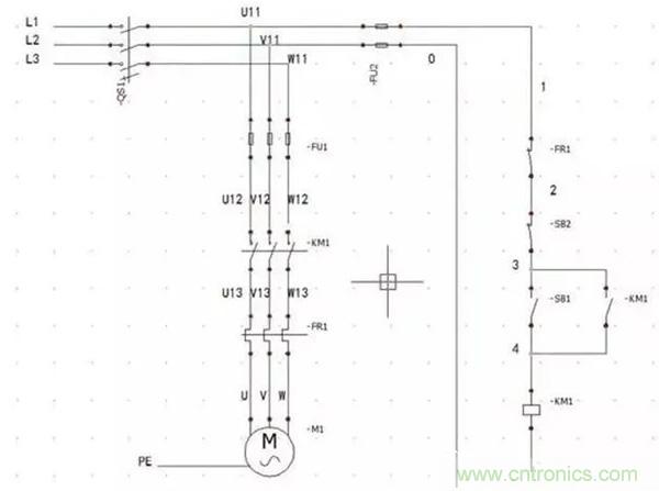 接下來我們看一下是怎么應(yīng)用的,先看一下一個(gè)帶有過載保護(hù)的接觸器自鎖控制的電路