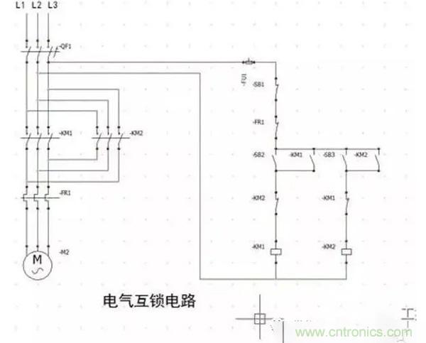 正反轉(zhuǎn)的控制回路只是在KM1的正轉(zhuǎn)回路上增加了一個(gè)KM2的常閉輔助觸點(diǎn),同時(shí)也在KM2的反轉(zhuǎn)回路上增加了一個(gè)KM1的常閉輔助觸點(diǎn),這就是所謂的互鎖電路