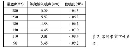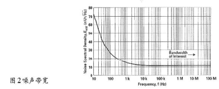 噪聲值—當運放作為有源器件時,RF噪聲值與運放噪聲是一回事。熱噪聲有一定影響,但RF電路使用的電阻通常較小,它們的噪聲可忽略不計。運放RF電路的噪聲與增益和帶寬有關(guān)。例如,使用一個運放,應用于10.7MHz中放,信號電平0dBV,增益為1,噪聲譜密度如圖2所示。此外,帶寬越窄,噪聲越低,見表2。