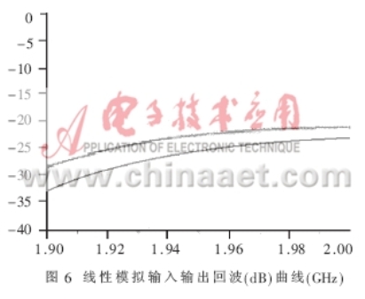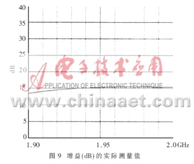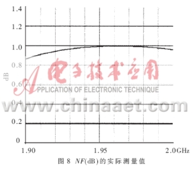 得到了完整的電路PCB板后,就要實(shí)際測(cè)量電路的各個(gè)參數(shù),驗(yàn)證設(shè)計(jì)的仿真結(jié)果是否與之相符,是否最終符合表1的設(shè)計(jì)技術(shù)規(guī)范。本文所采用的測(cè)試儀器是HP8753ES網(wǎng)絡(luò)分析儀和HP8970B噪聲儀。圖8、圖9表達(dá)出放大器實(shí)測(cè)的NF和增益曲線,在帶寬為0.1GHz的頻率范圍內(nèi)NF的值在0.8dB和1.0dB之間,增益在1.97GHz達(dá)到最大值15.5dB,在1.99GHz達(dá)到了15.3dB。由于NF是在實(shí)際PCB板外腔體內(nèi)測(cè)得的,包含了同軸連接器的損耗和二級(jí)噪聲損耗,其測(cè)量指標(biāo)表明實(shí)際的電路NF特性要稍差于模擬特性。圖10是輸入、輸出的回波曲線。當(dāng)頻點(diǎn)在1.96GHz時(shí),輸入回波為18dB,輸出回波達(dá)到22.5dB,放大器的OIP3在直流偏置Vds=3V,Id=60mA時(shí)測(cè)得值為37dBm,P1dB為21.4dBm。電路在較低的偏置狀態(tài)下Vds=3V,Id=40mA放大器的NF和增益都沒(méi)有降低,只有OIP3測(cè)出下降為36.5dBm。