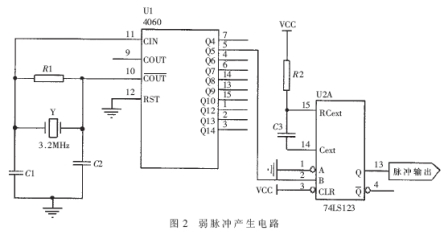 利用數(shù)字電路產(chǎn)生周期脈沖信號(hào)的方法有很多,本文采用的是利用方波發(fā)生器4060產(chǎn)生周期為20μs的方波信號(hào),然后觸發(fā)單穩(wěn)態(tài)觸發(fā)器74LS123產(chǎn)生脈寬為50ns~150ns可調(diào)的脈沖周期信號(hào)。電路原理圖如圖2所示。