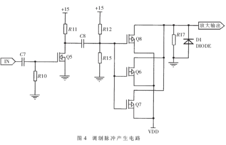 弱脈沖放大電路的輸出脈沖通過(guò)控制MOS管的通斷控制電容的充放電,從而形成符合要求的調(diào)制脈沖,驅(qū)動(dòng)振蕩器工作。調(diào)制脈沖產(chǎn)生電路如圖4所示。