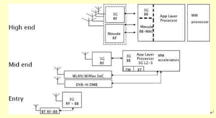 隨著多種無線技術(shù)標(biāo)準(zhǔn)在便攜無線設(shè)備中獲得應(yīng)用,客觀上要求便攜式無線設(shè)備以有成本效益的方式支持多個(gè)頻段以及多種不同的調(diào)制方式。業(yè)內(nèi)專家認(rèn)為[1],目前多種無線標(biāo)準(zhǔn)在便攜式無線設(shè)備中的聚合將遵循入門級(jí)、中檔和高檔三種技術(shù)方案(圖1),采用CMOS數(shù)字無線電技術(shù)和可配置無線電技術(shù)是將來最終的解決方案。