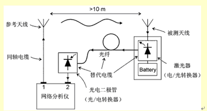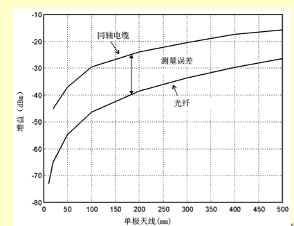 一般地講,我們不知道發(fā)射元件的效率和放大器的增益分別是多大(至少不能通過測(cè)量得到,但可以通過模擬或者模型分析得到這些數(shù)據(jù))。相反,G/T損失是直接通過測(cè)量天線的輸出噪聲總功率得到的,這時(shí)天線是放在一個(gè)特殊的環(huán)境中(例如在消聲室中,Ta=T0),增益是用增益置換法借助一個(gè)增益已知的參照天線通過測(cè)量得到的。但是要小心。要通過標(biāo)定把測(cè)量設(shè)備產(chǎn)生的噪聲去掉,在測(cè)量時(shí)沒有金屬物體(同軸電纜線或者電源線)和它相連。由于這個(gè)原因,萊爾德科技公司研制了一種代替電纜線的系統(tǒng),它利用了光纖的原理,連同一個(gè)用電池供電的前置放大器,這些在一起可以妥善地測(cè)定小天線的電氣特性(見圖1)。估計(jì)同軸電纜線引入的測(cè)量誤差的設(shè)置如圖2所示。圖2中,在單極天線從基板上伸出來的長(zhǎng)度不同的情況下,用同軸電纜線和光纖系統(tǒng)測(cè)量了它們的增益。可以看到,在長(zhǎng)度為10mm左右(這是內(nèi)置天線的實(shí)際長(zhǎng)度)時(shí),測(cè)量誤差超過20dB。