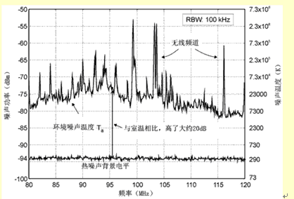 由現(xiàn)場(chǎng)測(cè)試可知,在接收FM調(diào)頻信號(hào)時(shí),ActivvTM有源天線的性能相當(dāng)于耳機(jī)連接線型天線,雖然這兩種天線的尺寸有很大差別??紤]到有源天線的體積小,它的幅射電阻大約只有1mΩ,而寄生損失電阻至少有1Ω左右,增益在-30~-50dBi的范圍內(nèi)。對(duì)于大多數(shù)RF工程師來講,這樣的增益是很難接受的。但是有一個(gè)因素極大地放寬了接收FM調(diào)頻信號(hào)時(shí)對(duì)增益的要求,即很高的環(huán)境噪聲溫度。圖8是一個(gè)消聲室(為了得到保守的估計(jì))在屏蔽裝置拿走后的噪聲電平。大多數(shù)無線系統(tǒng)工作在頻率高于1GHz的范圍,環(huán)境噪聲接近室溫,增益為-10dBi,相當(dāng)于信噪比降低了10dB,在FM頻段內(nèi),在城市的大部分地區(qū),由于人為噪聲的影響,噪聲電平高了大約20dB(對(duì)于調(diào)幅會(huì)更高)。因此,與完美的雙極電線相比,效率差的天線收到的信號(hào)較弱,噪聲較小。圖9給出了增益不同(0、-20、-40dB)的三種天線不同噪聲溫度時(shí)的G/T值。所有三種天線都接到噪聲指數(shù)為6dB的接收器上。對(duì)于增益為-40dB的實(shí)際天線(在室溫下G/T值減少46dB),當(dāng)情況相同時(shí),在23.000K的典型溫度下性能提高了19dB。對(duì)于有源天線,通過壓制接收器的噪聲指數(shù),可以把性能再提高6dB。所以,從信噪比方面看,增益為 -40dB的無源天線,只比完美的雙極天線差27dB。