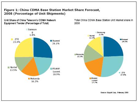 圖1所示為iSuppli公司對2008年中國電信的CDMA布署B(yǎng)TS市場份額,以及全國CDMA市場的預測。
