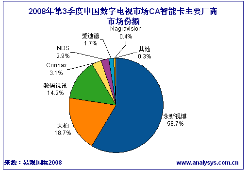 永新視博以58.7%的過半市場份額保持絕對領先,較上季度市場份額上升了15個百分點,而天柏和數(shù)碼視訊分別發(fā)卡67萬和51萬,都比上期有不少程度的下降。