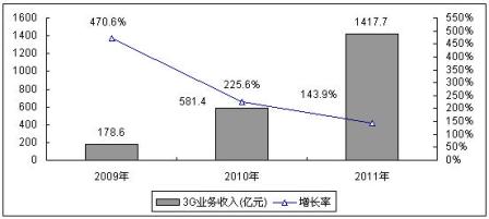 圖2 2009-2011年中國(guó)3G業(yè)務(wù)收入規(guī)模與增長(zhǎng)預(yù)測(cè)