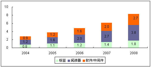 RFID在中國(guó)起步較晚,但受益于中國(guó)二代身份證市場(chǎng)的強(qiáng)勁需求,市場(chǎng)出現(xiàn)了短期大規(guī)模的井噴增長(zhǎng)。2004~2007年,中國(guó)RFID整體市場(chǎng)規(guī)模急速增長(zhǎng),到2008年隨著中國(guó)二代身份證市場(chǎng)的成熟,中國(guó)RFID整體市場(chǎng)銷(xiāo)售額出現(xiàn)下滑。
