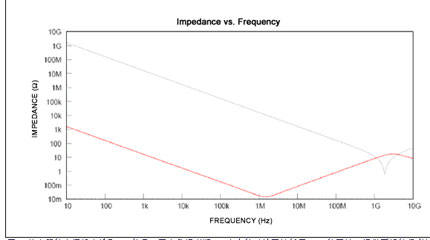 圖1.放大器的電源線會拾取RF信號。圖中數(shù)據(jù)表明1μF電容的對地阻抗低于10pF的阻抗,提供更好的噪音抑制能力