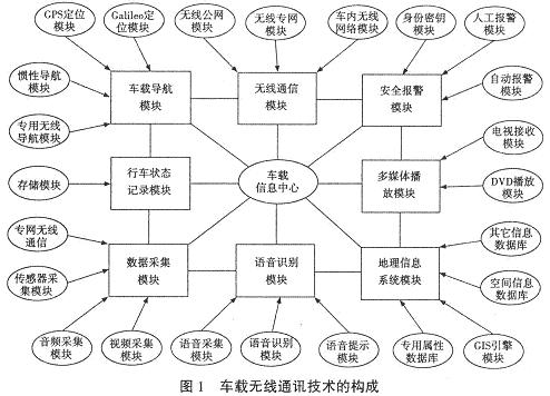車載無線通訊技術由車載導航模塊、車載無線通信模塊、安全報警模塊、行車狀態(tài)記錄模塊、多媒體播放模塊、數據采集模塊、語音識別模塊、地理信息系統模塊八部分組成。所有的數據都通過車載信息中心進行處理、協調,并作出正確的反應。圖l為車載無線通訊技術的構成。