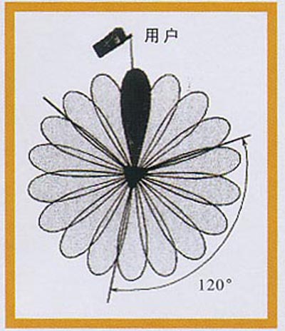 (1)波束轉(zhuǎn)換智能天線波束轉(zhuǎn)換智能天線具有有限數(shù)目的、固定的、預(yù)定義的方向圖,它利用多個并行窄波束(15°~30°水平波束寬度)覆蓋整個用戶區(qū),每個波束的指向是固定的,波束寬度也隨天線元的數(shù)目而確定(見圖2)。波束轉(zhuǎn)換系統(tǒng)實現(xiàn)比較經(jīng)濟(jì),與自適應(yīng)天線相比結(jié)構(gòu)簡單,無需迭代,響應(yīng)快、魯棒性好。但預(yù)先設(shè)計好的工作模式有限,窄波束的特性將極大地影響系統(tǒng)性能。