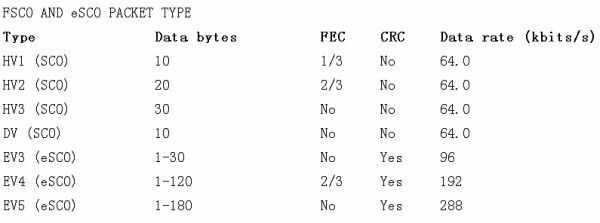 正如前面提到的,由于丟失或損壞數(shù)據(jù)的可能性較大,SCO信道采用了CVSD音頻編碼。其它編碼解碼器能提供較好的保真度,但在接收到有錯(cuò)數(shù)據(jù)時(shí)表現(xiàn)很差。有了eSCO更好的數(shù)據(jù)完整性,就有可能采用其它編碼器來改善音質(zhì)而無需提高64kbps的基本數(shù)據(jù)速率。.SCO數(shù)據(jù)固定數(shù)據(jù)速率為64kbps,具有對(duì)稱、支持全雙工的特點(diǎn)。采用eSCO會(huì)增加兩個(gè)多時(shí)隙的數(shù)據(jù)包,并支持不對(duì)稱的數(shù)據(jù)速率。事實(shí)上,根本沒有數(shù)據(jù)需要傳輸。如果一條eSCO信道是單向的,例如語音博物館向?qū)?audiomuseumguide),接受設(shè)備在接收到一個(gè)數(shù)據(jù)包后回發(fā)一個(gè)很小的叫做NULL的包以表示確認(rèn)。基于協(xié)商的參數(shù),利用多時(shí)隙數(shù)據(jù)包,eSCO信道上的數(shù)據(jù)速率可能高至288kbps,這使支持包括視頻傳輸在內(nèi)的高階編碼解碼器成為可能。