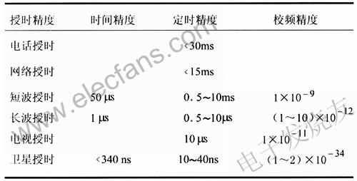 衛(wèi)星授時GPS導航系統(tǒng):提供的時間信號對世界協(xié)調時跟蹤,精度優(yōu)于100ns。GPS全球覆蓋,接收設備體積小,可以接收6顆衛(wèi)星信號,可用來提供2.048Mbit/s基準時間信號。俄羅斯的GLONASS衛(wèi)星導航系統(tǒng):目前系統(tǒng)未完成完善,接收設備商業(yè)化不夠。中國的北斗導航系統(tǒng):精度達到50ns,目前覆蓋中國,同步衛(wèi)星信號接收設備體積較大,系統(tǒng)還未建成。(3)網(wǎng)絡授時:通過互聯(lián)網(wǎng)授時。使用NTP(NetworkTimeProtocol,網(wǎng)絡時間協(xié)議,RFC1305)。(4)電話授時:通過公共電話網(wǎng),用戶用調制解調器接首時間信號。(5)電視授時:通過電視網(wǎng)授時。(6)電信有線傳輸網(wǎng)授時表1是授時精度比較表1
