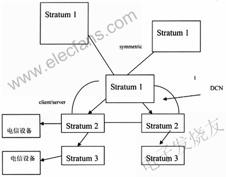 本地網(wǎng)級的Stratum1時間服務器之間互相聯(lián)網(wǎng),以symmetric方式互相校時,避免GPS時間源出故障造成中斷,還可以達到更高精度。Stratum1時間服務器對下級采用client/server方式。Stratum1時間服務器取得GPS時間信號和其他授時方式時間信號,比如其他導航衛(wèi)星,短波,長波方式,互為備用。上下級Stratum采用DCN相連或專線相連,保持穩(wěn)定相連。各級時間服務器把時間信號發(fā)到各個通信設備,如圖3所示。