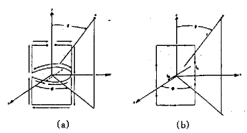 如圖2(a)所示。此處我們選擇螺旋中心為原點,螺旋軸為Z軸,頂面和底面上天線臂的平行線為Y軸來建立坐標系,另外柱面上的螺旋部分近似用直線和半圓的組合來代替,圖中的實箭頭表示電流方向,虛箭頭表示圓上電流的矢量和。顯然該模型可更進一步簡化為圖2(b)所示的一個YZ平面上的電流環(huán)和一個X軸上的電偶極子的組合。同樣跟它垂直的另一付雙臂螺旋天線亦可等效成一個XZ平面上的電流環(huán)和一個Y軸上的電偶極子的組合。根據(jù)天線的基本原理,由于這兩組電流環(huán)和電偶極子互相垂直且相差90°,那么在遠區(qū)得到的是一個寬波束的心臟形圓極化方向圖。