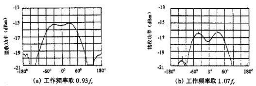 其中λC表示中心頻率對應(yīng)的波長。最后得到該天線的實測結(jié)果如圖3、圖4所示。圖3(a)中的曲線1表示在HP8510B矢量網(wǎng)絡(luò)分析儀上測得的四臂螺旋天線的駐波比特性曲線,為了便于比較,在同樣條件下測得的八臂螺旋天線駐波比由曲線2給出,可見八臂螺旋能明顯地展寬天線的頻帶;圖3(b)表示在相同的儀器上測得的史密斯阻抗圓圖。此處我們根據(jù)要求將天線的頻帶設(shè)計在14%,而事實上可以做得更寬。圖4(a)和(b)分別為工作頻率取0.93fc和1.07fc(即圖3(a)中的標記2和3)時,由頻譜儀測出的遠區(qū)輻射方向圖,它們的半功率寬度分別達到140°以及145°左右,這么寬的波束是其它形式的天線很難達到的。