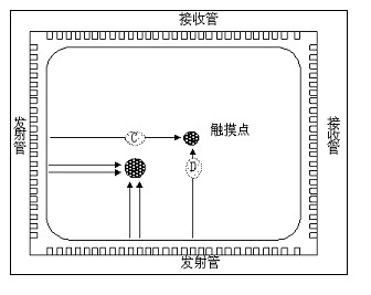 當(dāng)有觸摸時,手指或其它物就會擋住經(jīng)過該位置的橫豎紅外線,觸摸屏掃描時發(fā)現(xiàn)并確信有一條紅外線受阻后,紅燈亮,表示有紅外線受阻,可能有觸摸,同時立刻換到另一坐標(biāo)再掃描,如果再發(fā)現(xiàn)另外一軸也有一條紅外線受阻,黃燈亮,表示發(fā)現(xiàn)觸摸,并將兩個發(fā)現(xiàn)阻隔的紅外對管位置報告給主機(jī),經(jīng)過計算判斷出觸摸點在屏幕的位置。